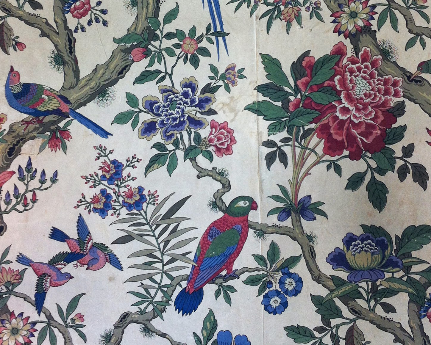 Two full-sized ash beds with pale green linens in a room adorned with green floral wallpaper. Also features two wardrobes of the same wood as the beds, a small matching bookcase, a pink chaise, and petite iron writing desk. Adjacent is a small dressing room, though the residents must use facilities elsewhere. Overlooks the brick wall of the building next door.